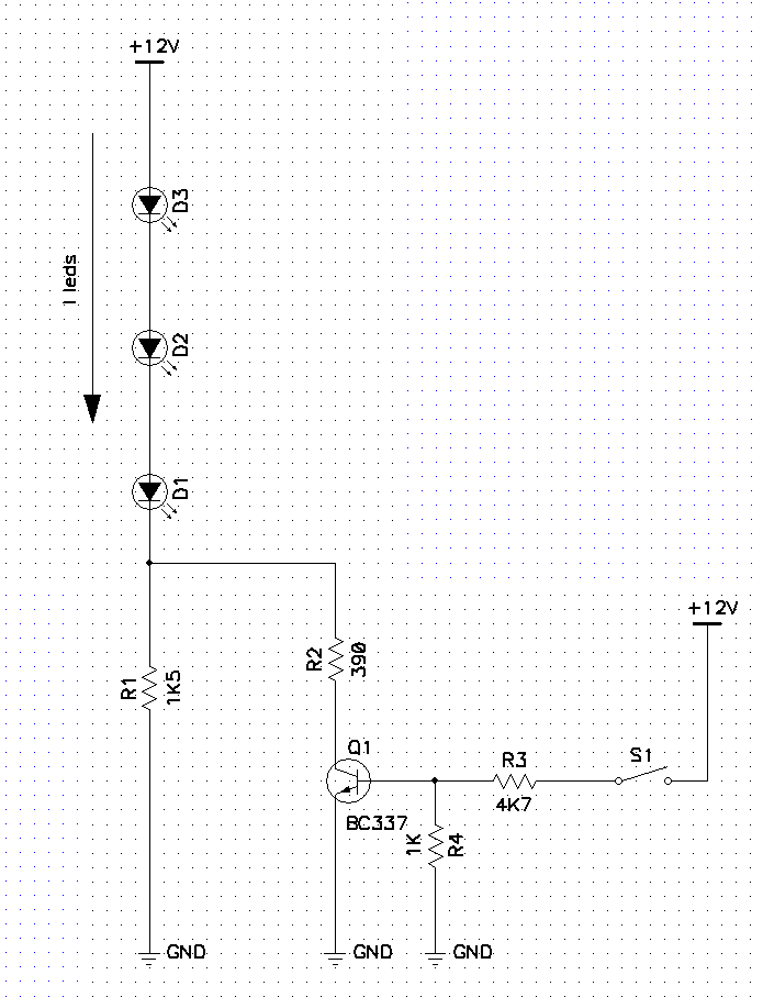 Para el ejemplo, hemos utilizado 3 leds (D1, D2 y D3) en serie, con una resistencia limitadora de corriente que llamaremos R1. Nuestra alimentación será de 12 VDC o corriente directa (corriente contínua).